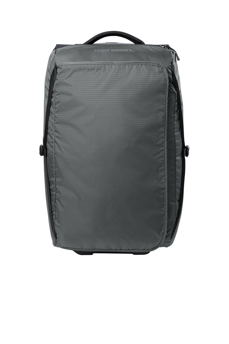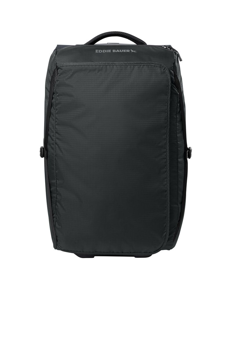 Tonal heat transfer Eddie Bauer logo on top of duffel