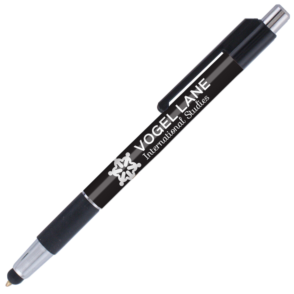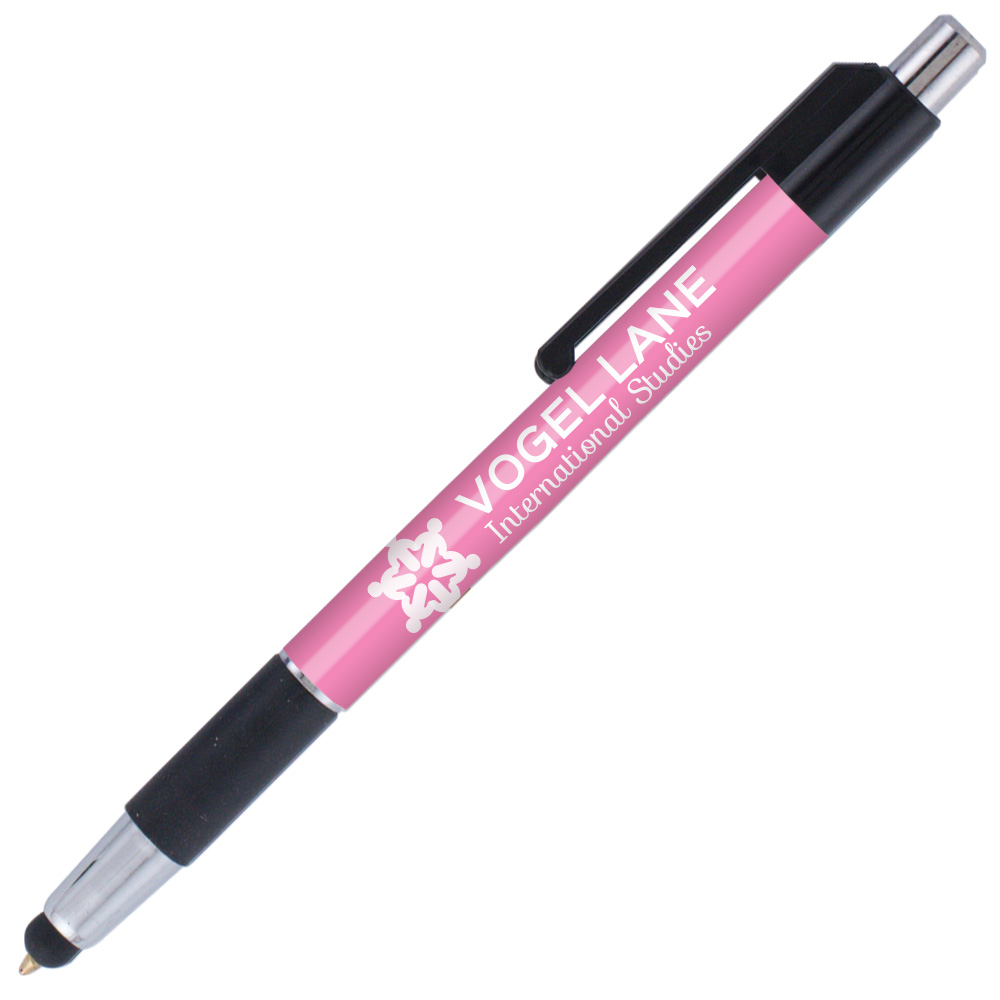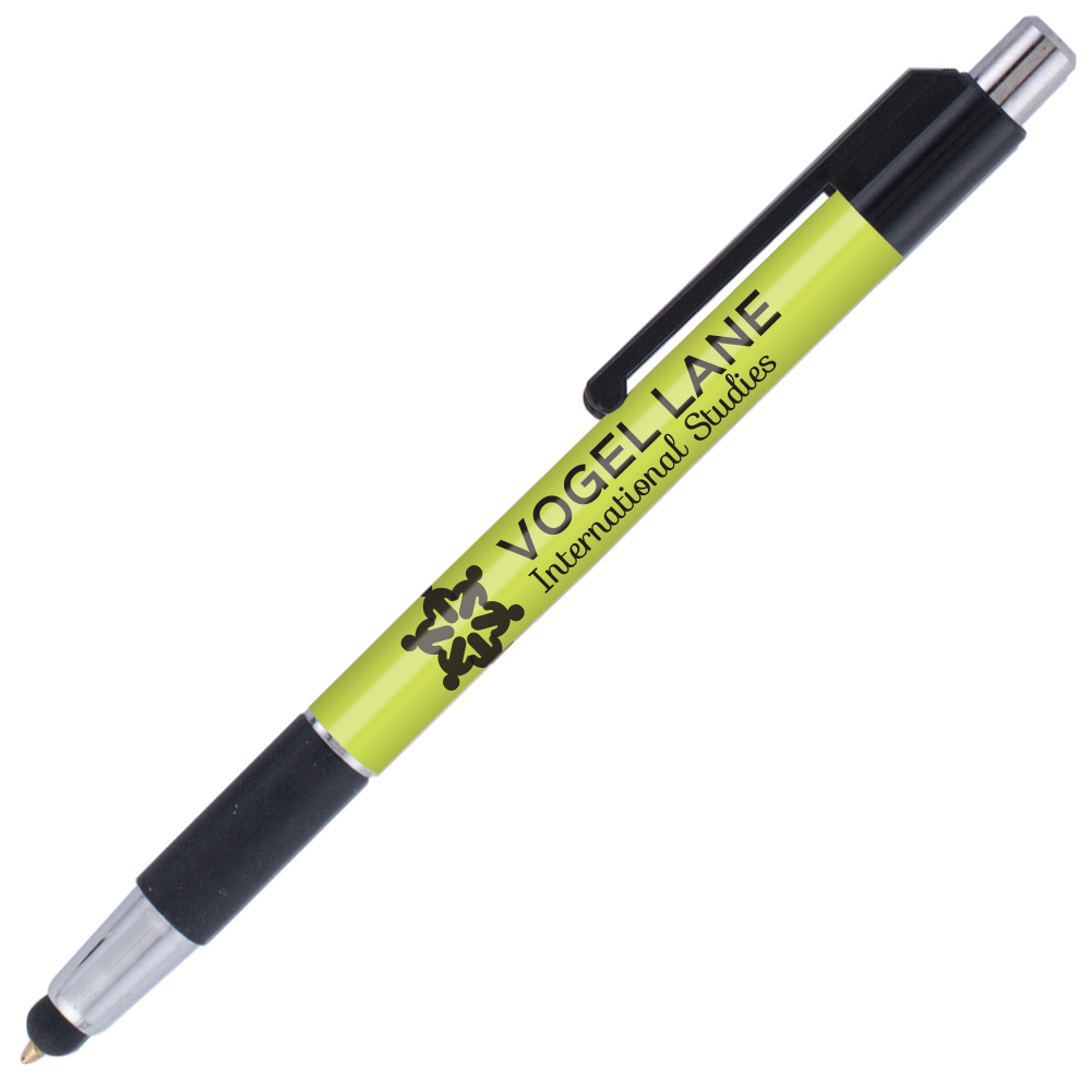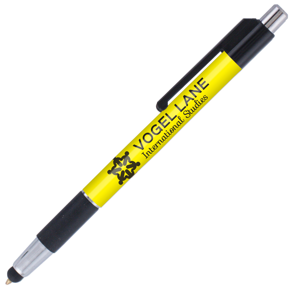 Weighted - A stylus version of our popular colorama trimmed with bright chrome accents and a rubber grip. This USA Made* plastic pen features our SimpliColor™ printing process giving you a huge imprint area with virtually unlimited colors. No set-up fees, no run charges and free ground freight. Our gelike, Eversmooth® ink gives you an extraordinary writing experience in black and blue ink choices. *(Product is USA Made of US and Import Parts)