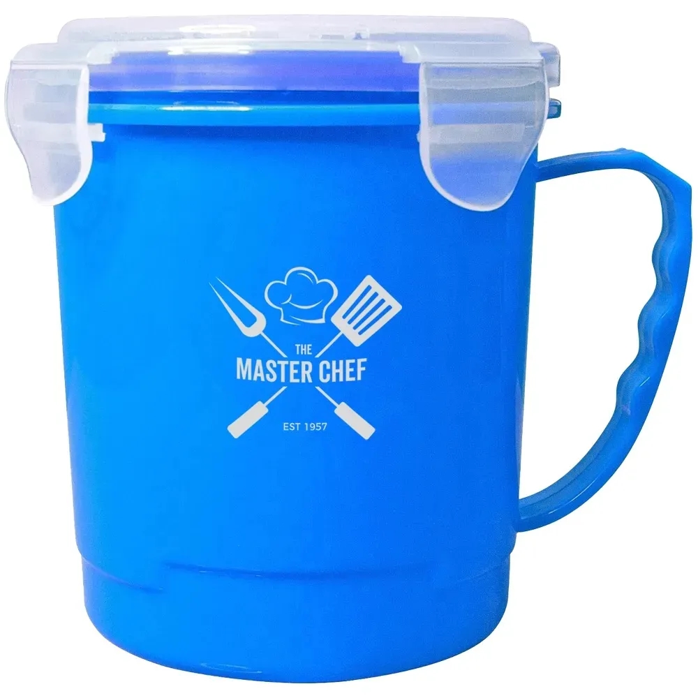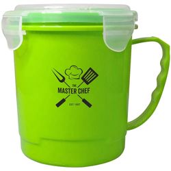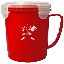 24 oz. BPA free soup mug with handle. It holds three cups and has a vent on the lid to release heat. Freezer and microwave safe. Dimensions: 4.25"D x 5"H.